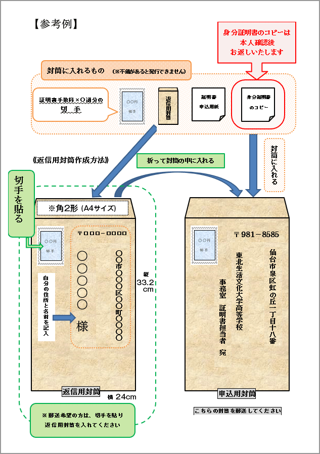 ダウンロードした証明書申込用紙もしくは、便箋に下記の項目を明記し、発行手数料・公的身分証明書のコピーを同封し、下記の窓口へ郵送でお申し込みください。出来上がり次第、本人宛に返送いたします。 ※郵送は時間がかかりますので、余裕をもって申し込んでください。