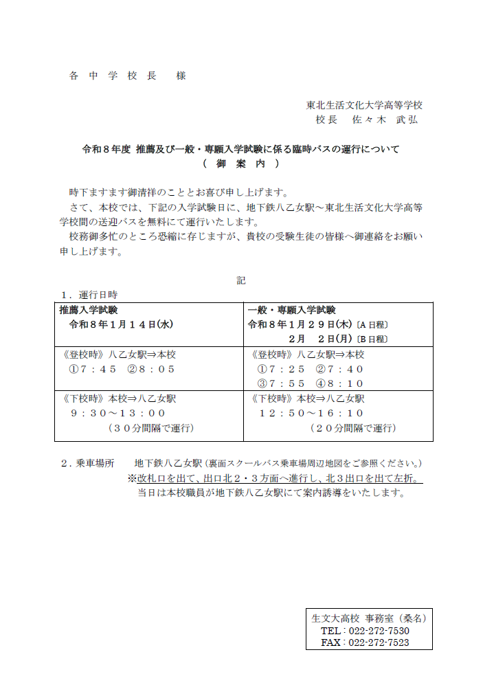 本校では、入学試験日に地下鉄八乙女駅及び各方面の臨時バスを運行いたします。