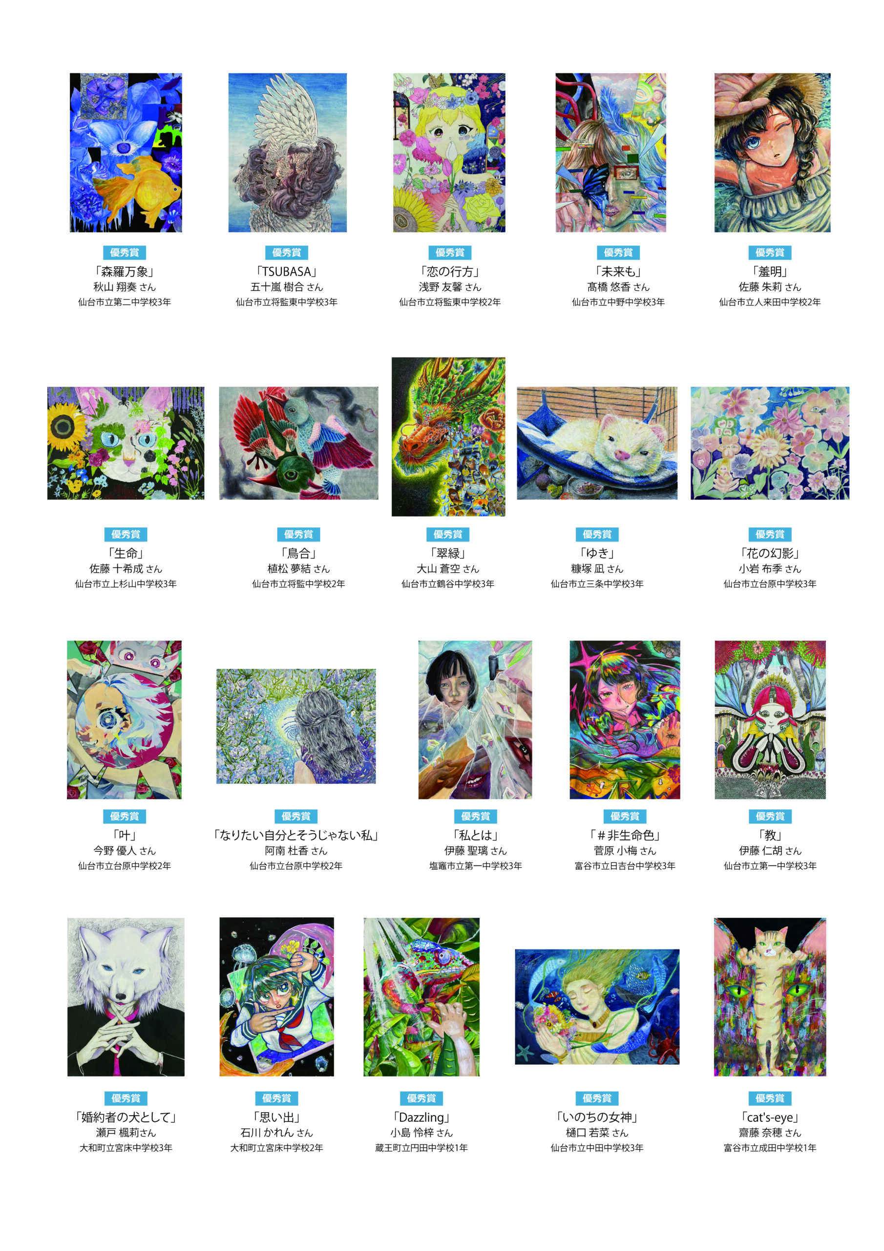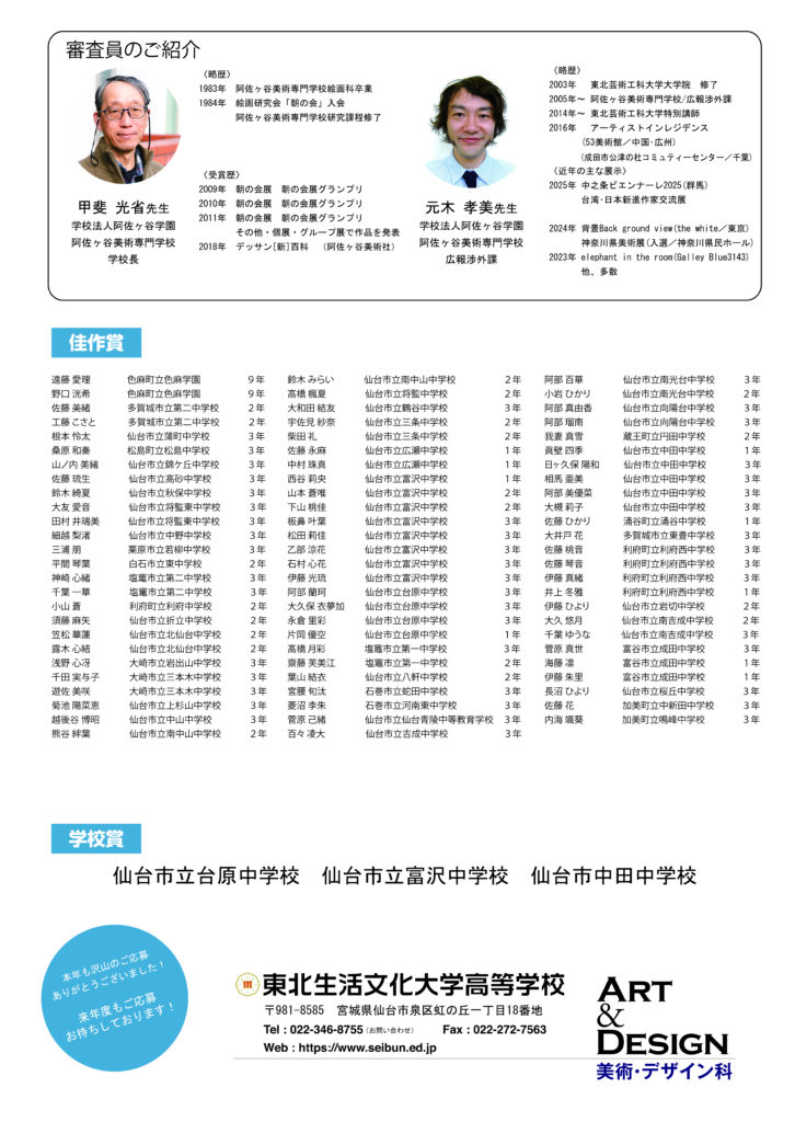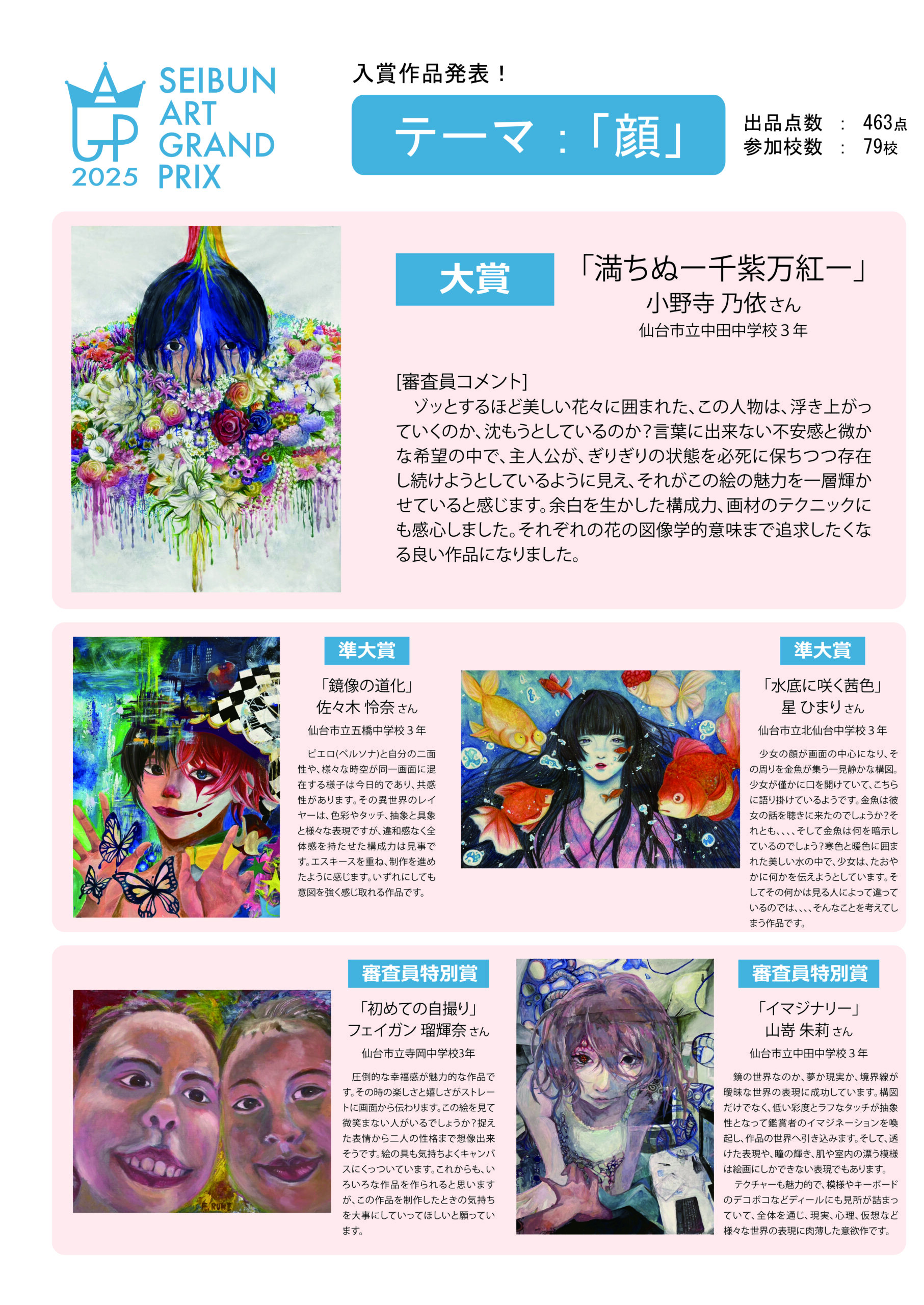 さて、この度は貴校の生徒の皆様より、SEIBUNアートグランプリ2025へ多数の作品を出展いただき、誠にありがとうございました。今年も宮城県内を中心に優れた作品が集まり、出品校数79校、応募作品数463点と、非常に高水準のコンクールとなりましたことを、主催者一同大変喜んでおります。貴校ご指導の先生方に、心より感謝申し上げます。