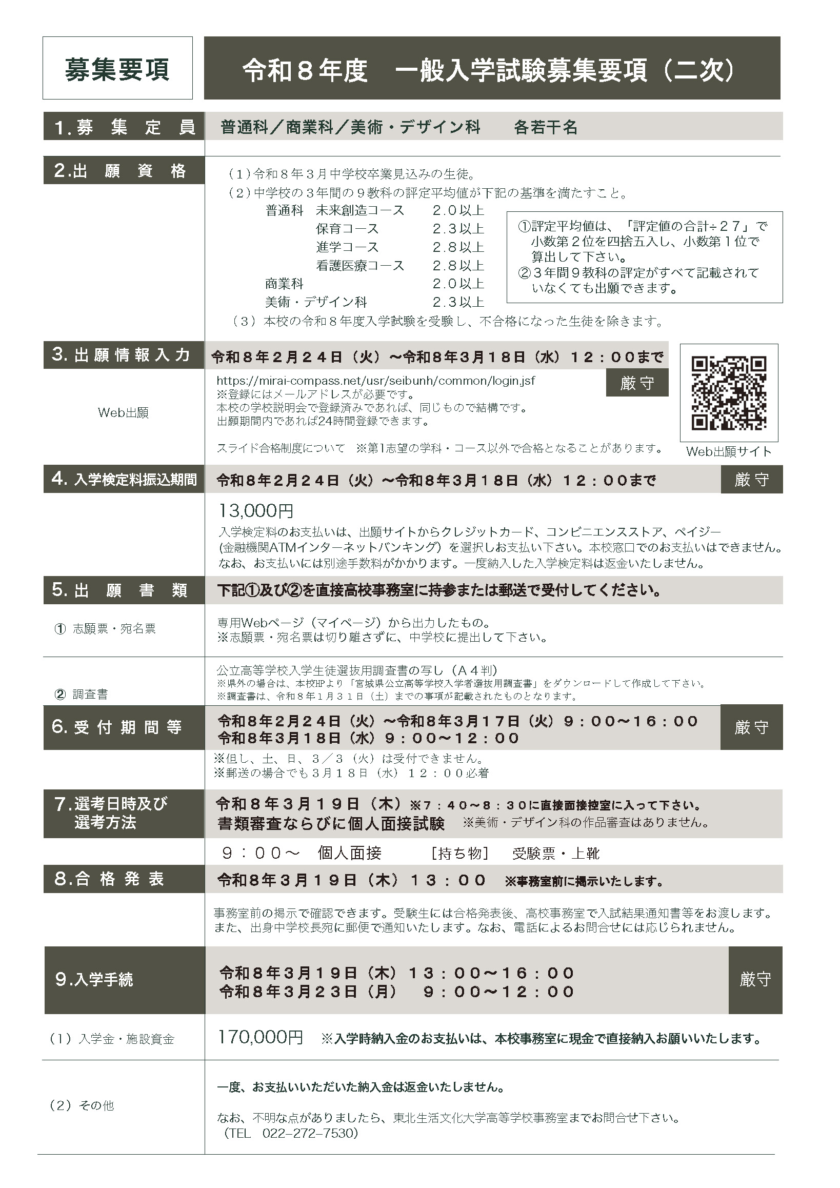 さて、本校では令和8年3月19日 (木)に一般入学試験(二次)を実施いたします。