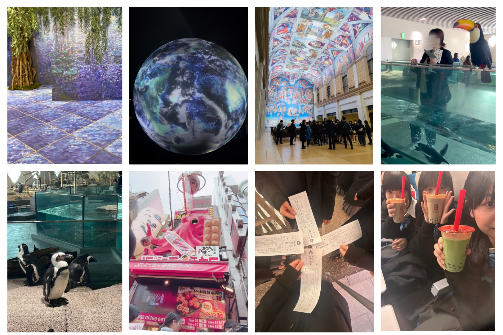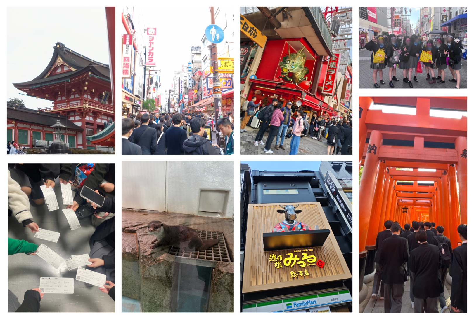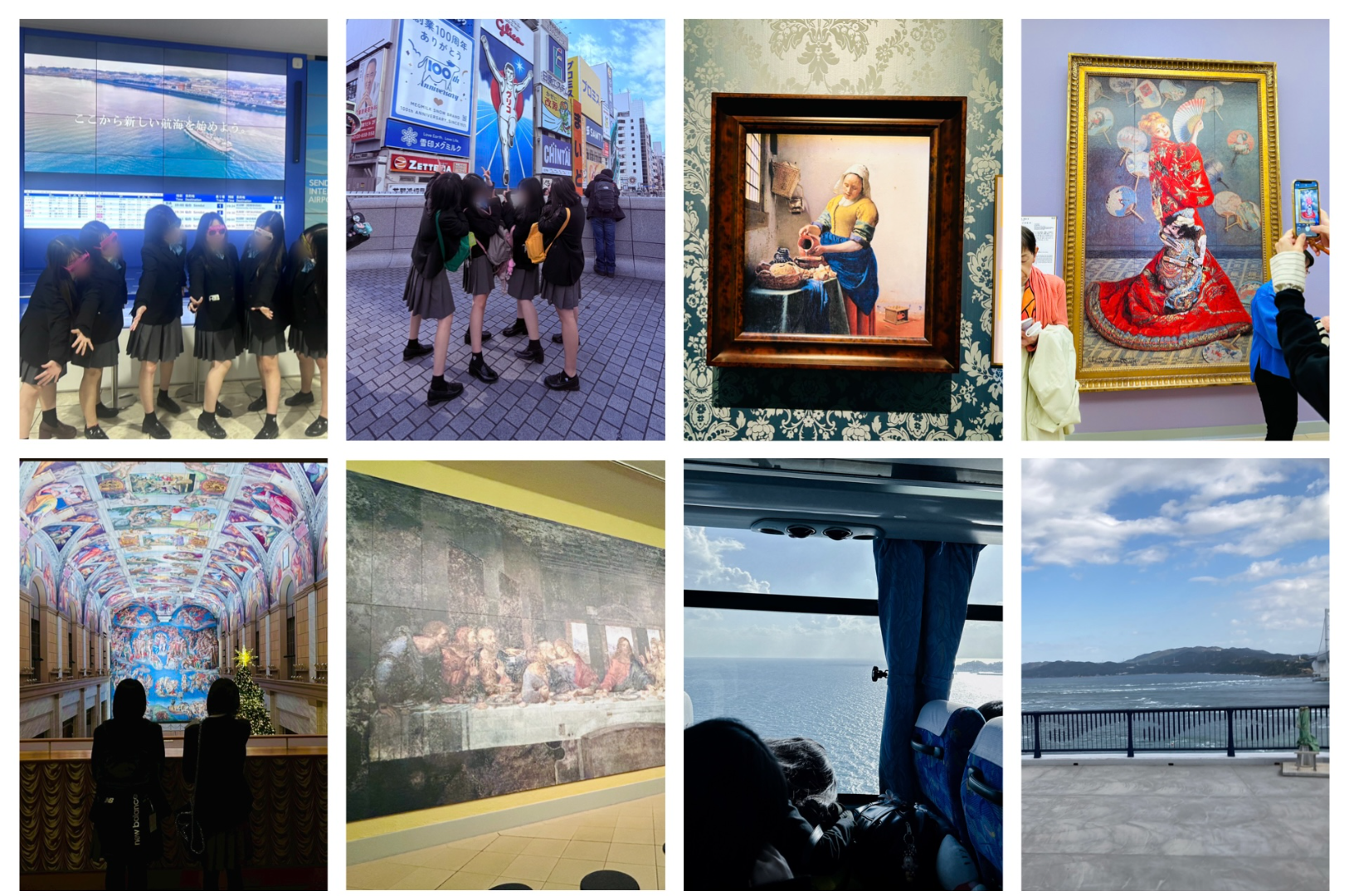修学旅行最終日では、ニフレルを見学しました。館内では生き物の展示をゆっくり見て回り、写真を撮りながら楽しみました。その後は道頓堀に移動し、大阪ならではのにぎやかな街並みを歩き、食べ歩きや観光を満喫しました。最後に空港へ向かい、飛行機は風で少し揺れてドキドキしましたが、無事に帰ることができました。到着した空港では先生や親御さん達が迎えてくれて、3泊4日の修学旅行を楽しく締めくくることができました。