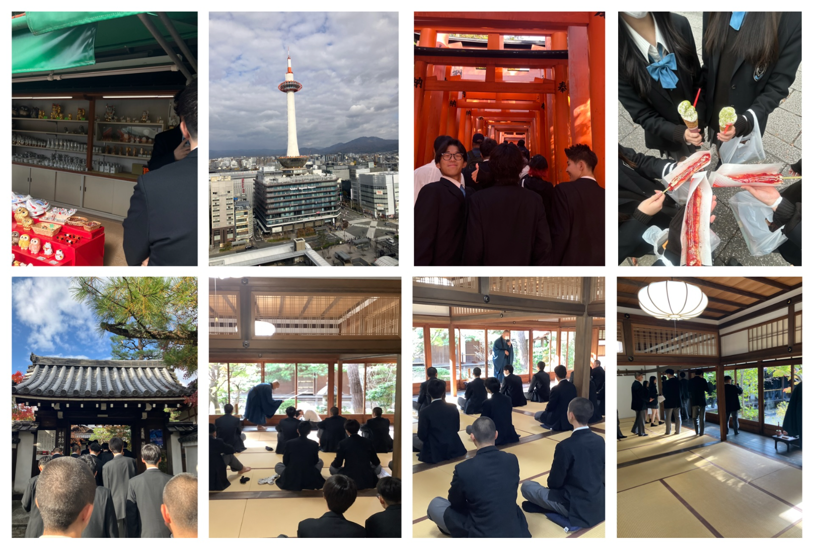 修学旅行では伏見稲荷神社で千本鳥居を見て、とても迫力がありました。京都駅周辺も観光し、美味しいものを食べたりお土産を選んだりして楽しかったです。帰りは新幹線でゆっくり過ごし、思い出に残る旅行になりました。